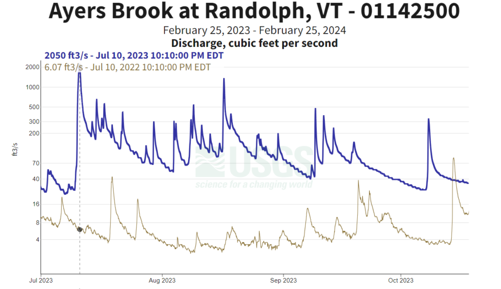 As if the events of early July weren’t enough, mother nature did not let up, instead insisting to deliver relentless rain. For the entirety of the summer the ground had hardly a moment to dry. For farmers, mountain bikers, and those battling basements growing mold this meant challenging conditions. For kayakers this meant entire weeks of sustained paddling. Typically in summer, and particularly in the past three years, boaters wait anxiously for the handful of boating opportunities that are presented. In 2023 the challenge was not waiting for the opportunity to paddle, but rather deciding when not to. Supporting evidence is easy to find. In July and August of 2023 The Lower Mad was runnable twice as much as it was not. On July 11th 2022 the Lamoille river at Johnson was running at a mere trickle of 91cfs. That same day in 2023 the flow was a staggering 24,200 cfs. A quick look at discharge graphs of several Vermont rivers make the difference of a year obvious. Here are the Lamoille, Winooski and Ayers Brook graphs comparing 2023 in blue and 2022 in tan.