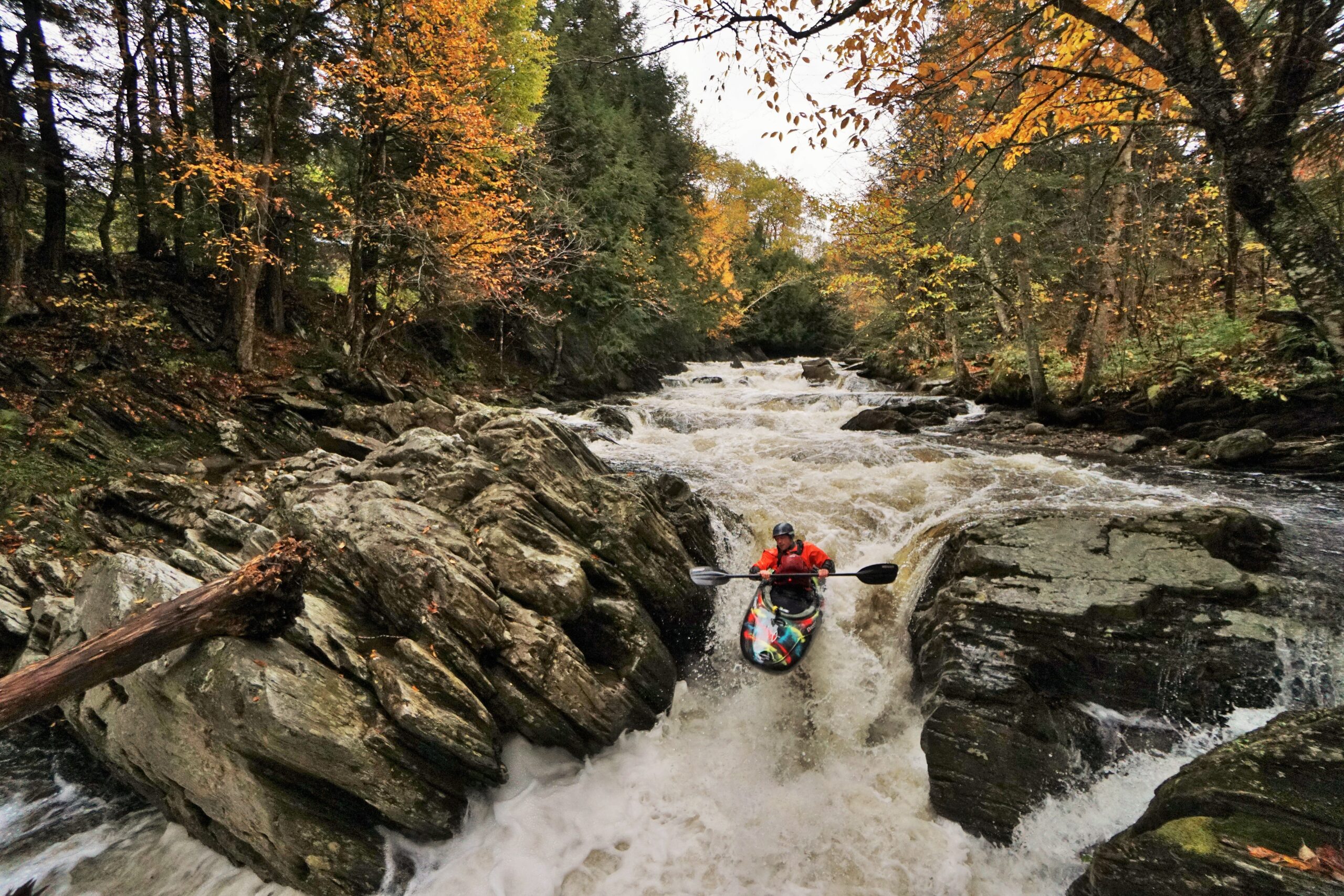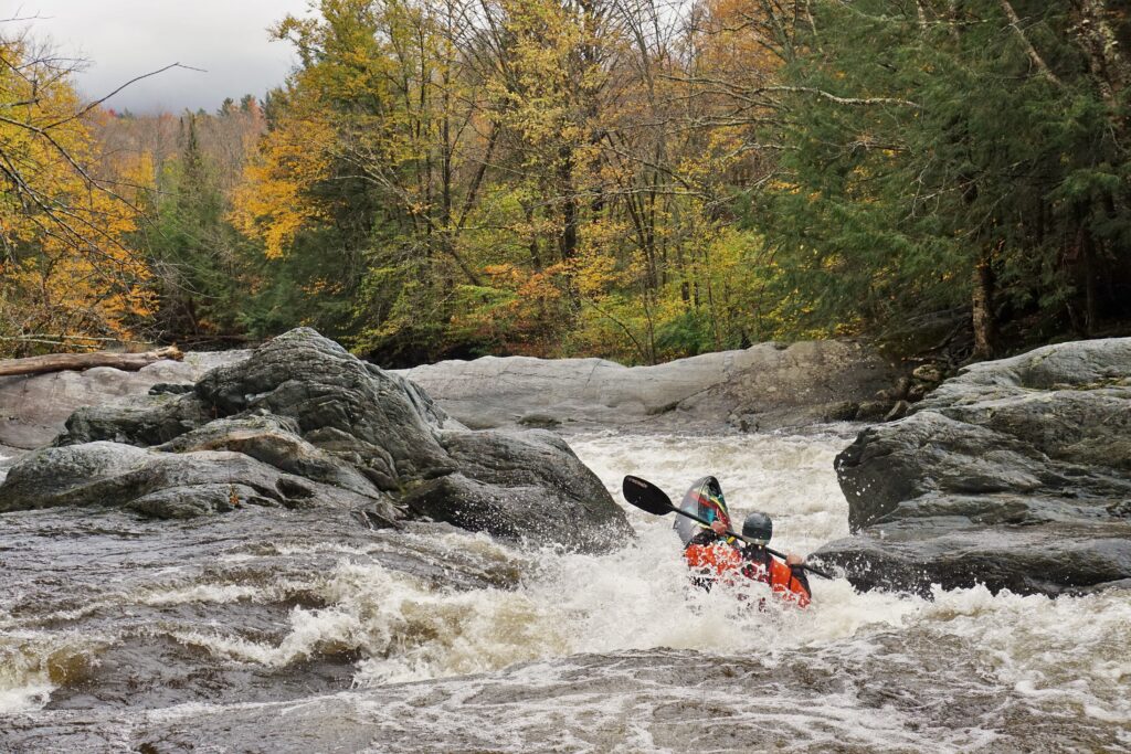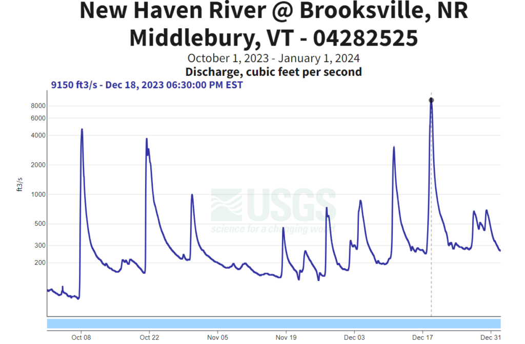 Winter seemed to have slept in. November and December arrived with little conviction. Though an early shot of snow provided optimism for skiers, it quickly disappeared with warm weather and rain that made quick work of the nascent snowpack. In Burlington December was the 2nd warmest on record. As a final reminder of the year we experienced, a significant storm came through just a week before Christmas that sent rivers spiking for the final time of the year. In any other year this storm would have been easily the most notable event. New Haven crested at > 9,000 cfs, the Lamoille at Johnson at > 16,000, and the Mad at > 12,000 (even higher than it’s peak in the July flooding). But after the crazy year of 2023 Vermont kayakers simply shrugged their shoulders, swapped the skis and poles for paddles and boats and took advantage of the conditions given.