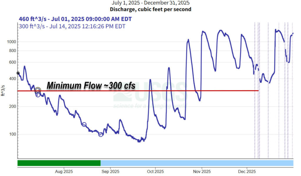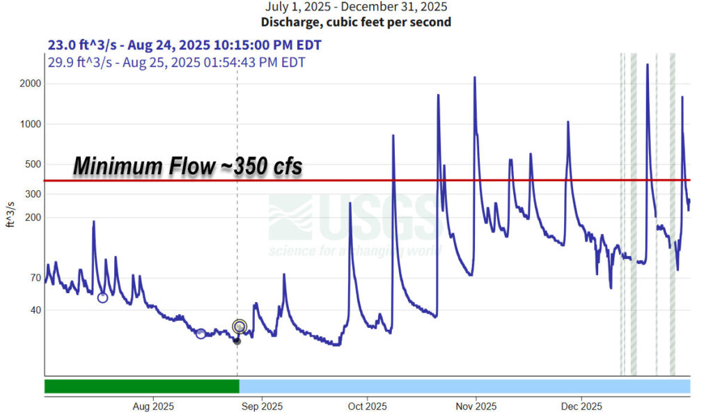 The weather meant boating in the state was virtually non existent. Even the most reliable summertime spots dipped too low to be worthwhile. Take Otter Creek for example. The gorge section is nearly always runnable with a standard minimum considered to be around 300cfs, which is typically seen for most of the summer. This was not so in 2025, as flows dipped below that by mid July, and did not rebound in earnest until November (save for a few isolated bumps in mid October). The New Haven River was so low you could have ridden a bike down the river bed, with several months of flows below an abysmal 50cfs and a nearly month where a meager 30cfs ran past the USGS gauging station by the route 7 bridge.