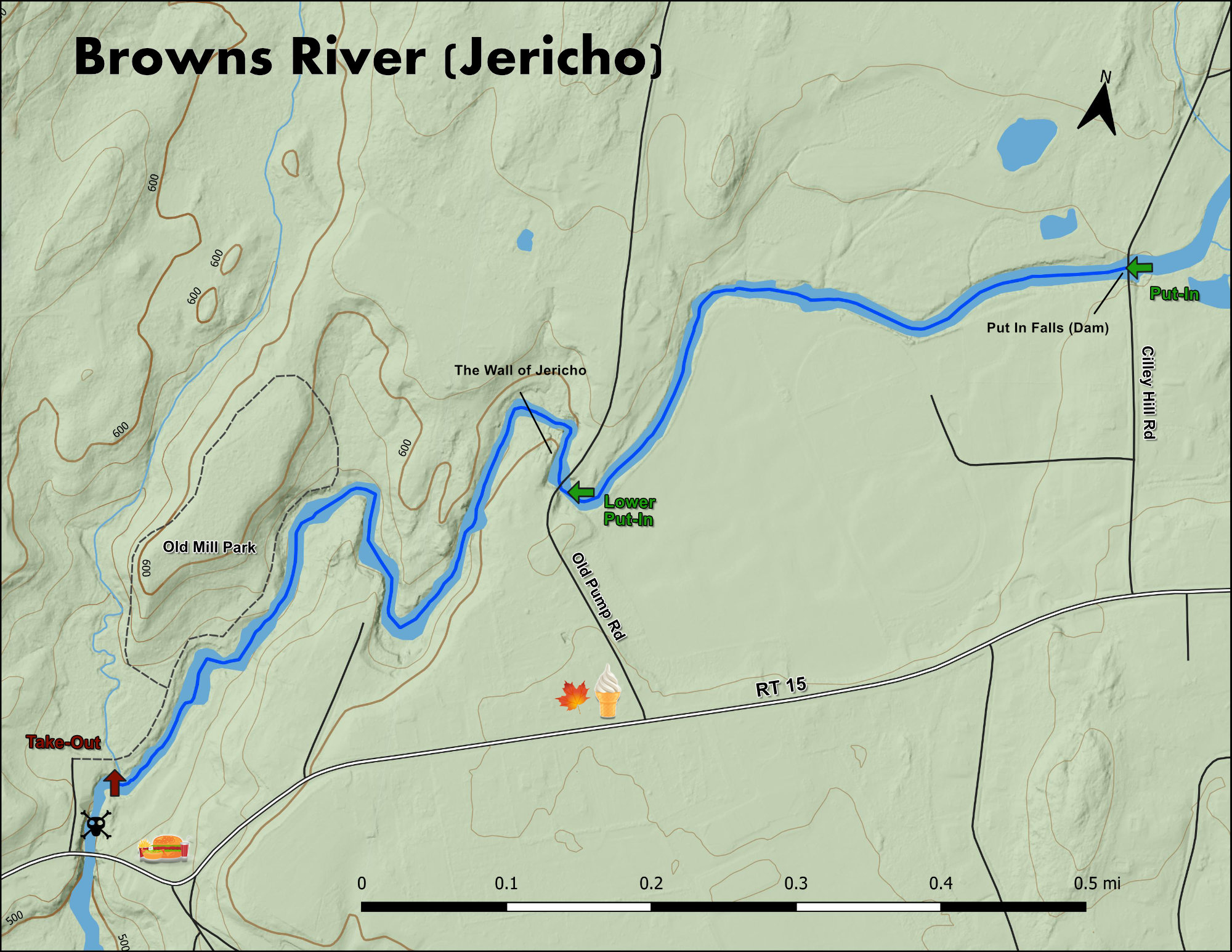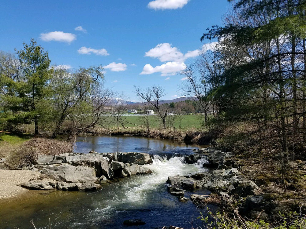 Starting at the waterfall/dam on Cilley Hill Road the line is river right and be sure of it since messing up means landing on rock. Moving water with a small ledge rapid leads to the lower (normal) put in at Old Pumphouse Rd. Just upstream of the bridge is a three foot ledge with a nice boof flake on the right. Passing under the bridge brings you to an abrupt right turn named the “Wall of Jericho” (III+). A shear wall on the river left and a tight rapid with a hole halfway. The key is to be in the middle with just enough right angle when you hit the hole. Some shallow boogie in a left turn leads to a straight forward horse shoe rapid (III). Then the river opens up and turns right through some boogie and a surfable wave brings you to a pool above a great boof. Most of the water constricts to the left side with a fantastic four foot boof.