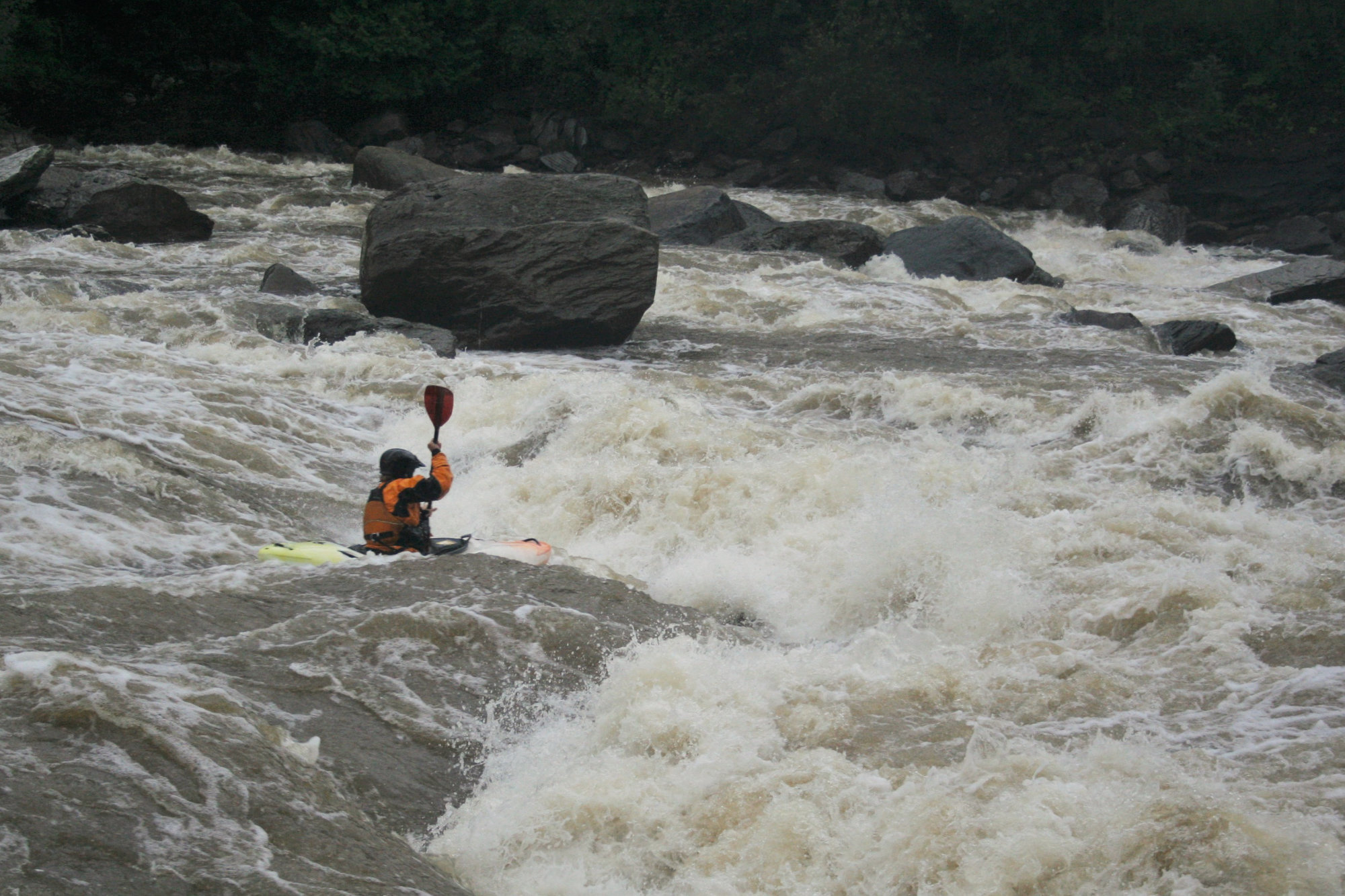 The warm up is fun and starts just a hundred feet downstream of the put-in. A handful of nicely spaced class III rapids let you surf and move around the river. These continue as you come around the first corner to the top of Tetanus Schott. Tetanus is the biggest rapid on the run and is best scouted from the right. At most levels the crux is avoiding a sticky hole placed perfectly in the middle of the rapid at the bottom with only small lines to the left and right allowing safe passage. At its stickiest the hole can give some solid rides and often results in a swim. Fortunately there is 100 yards of moving water below in which to collect the pieces. At higher levels the crux is threading the needle between two holes in the middle of the rapid and then holding tight over the big crashing waves in the runout.