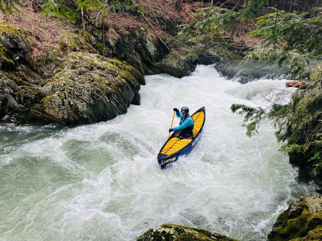 Next up fifty yards or so after Moose Wedge is T-bone (aptly named for reasons we won’t mention here). T-bone is a ledge drop with a boof on river right into an eddy (pending flows), and a drop into a wave-hole just left of center. At the bottom of T-bone, the gorge banks constrict even tighter so watch out for wood. Because of the constriction, there are some large boils and pressure forming subsurface potholes in the ledge wall on river left. Some folks have expressed concern about swimmer safety on the river left side of the constriction so keep an eye out and direct anyone swimming to river right (away from the river left wall and pressure) at the bottom of T-bone.