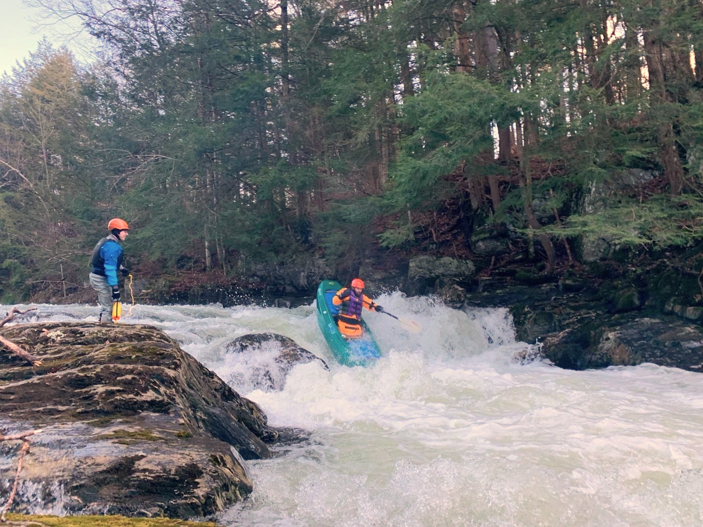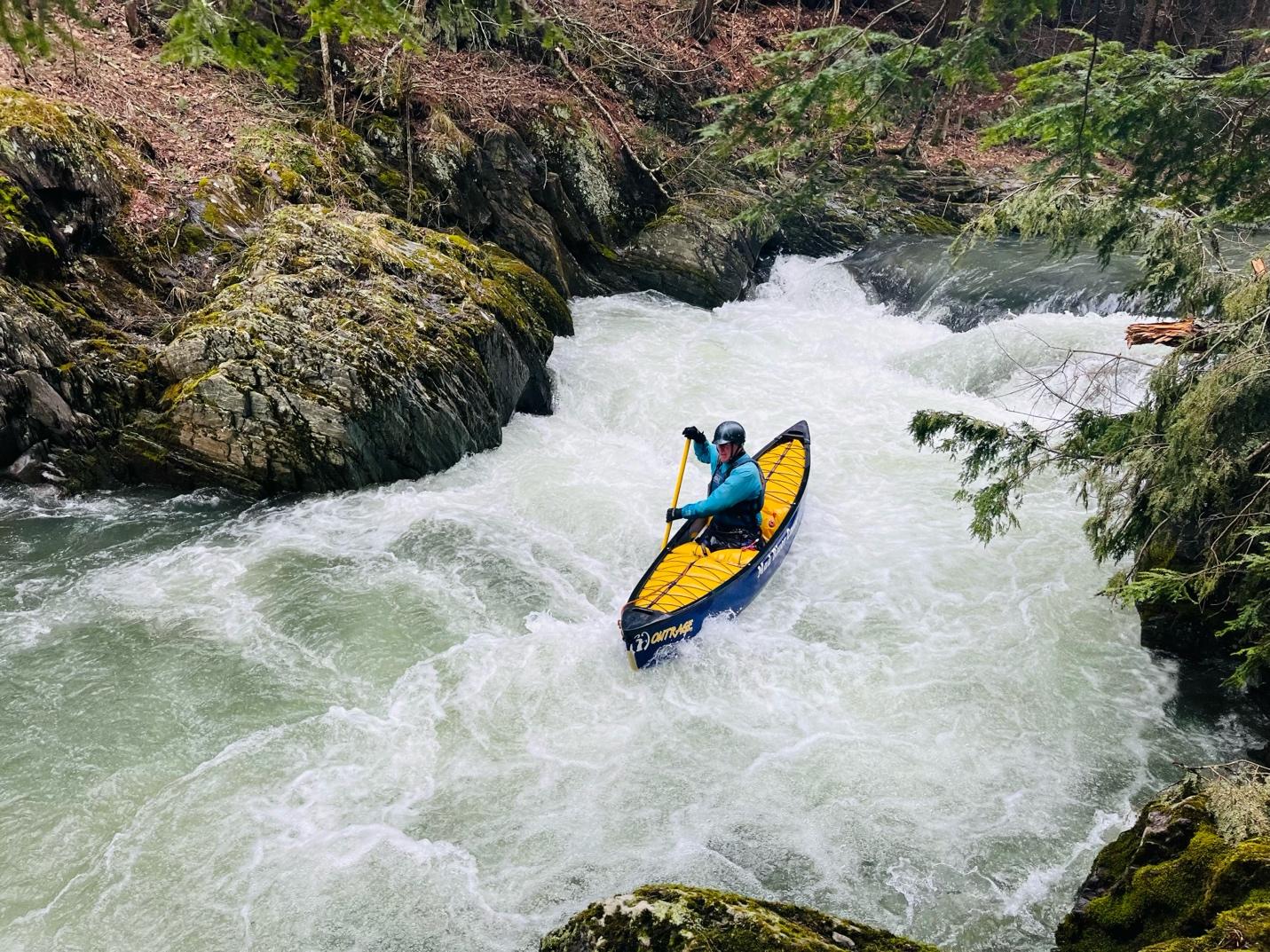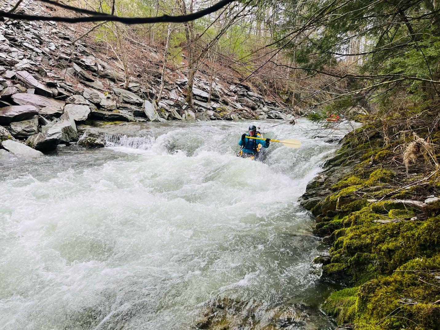 Moose Wedge (III) is a fun ledge drop with multiple lines. At medium and higher flows, there’s a boof on river right into an eddy. Slightly left of center is the traditional “safe” line for folks new to creeking. What’s neat about Moose Wedge is the beauty of the hemlocks, moss covered banks, slot-gorge-nature, and diversity of moves and lines for all abilities. (Note: Due to summertime swimming/trespassing issues, you will notice a lot of No Trespassing signs on the banks. If you do opt to scout, be respectful, leave no trace, and use your best judgement staying below the high water mark. To our knowledge, the controversial confrontations with boaters have historically been on the Lower Poultney below U.S. 4—not this run.) Finally, safety can be set up on river left directly next to, and below, Moose Wedge. If anyone swims, there’s ample recovery space and eddies before the next drop.